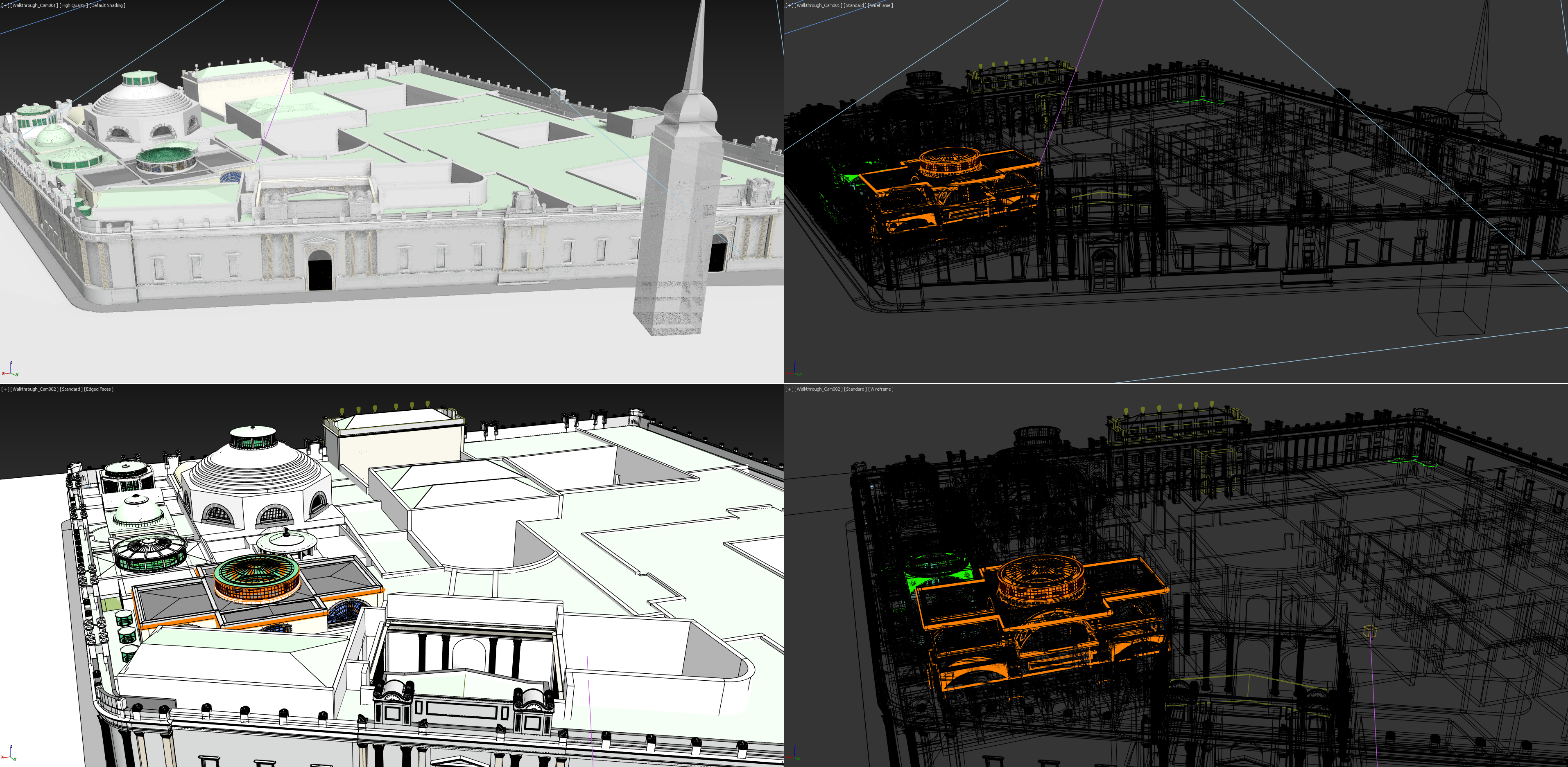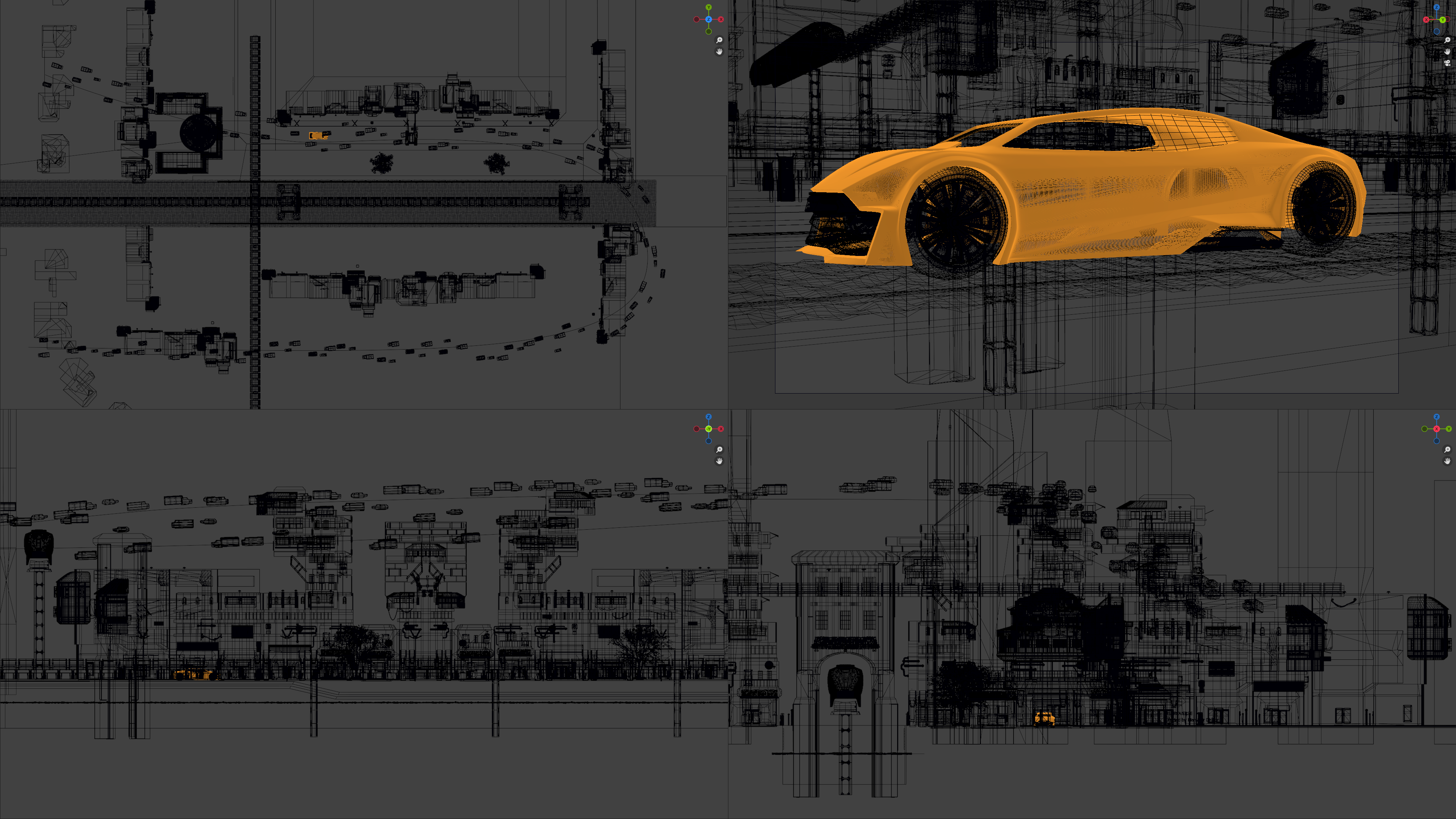 Wireframe metroverse scene on quad viewports
