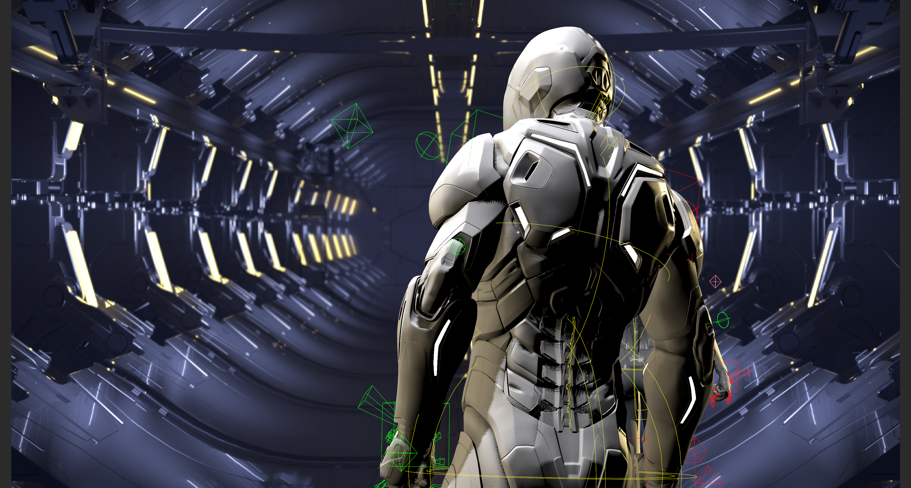 X-ray shaded metroverse scene with random color per object