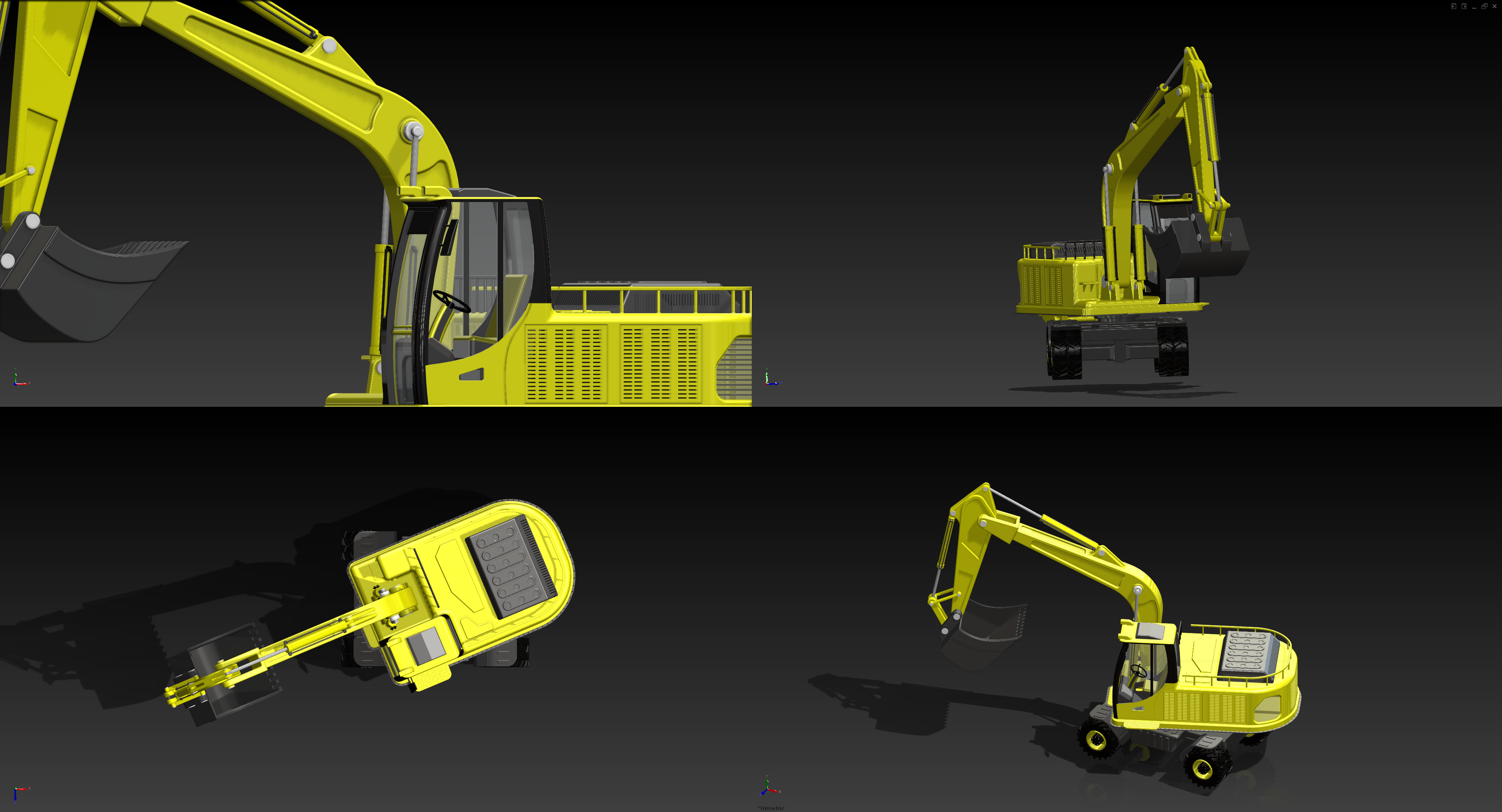 Shaded with edges excavator on four viewports