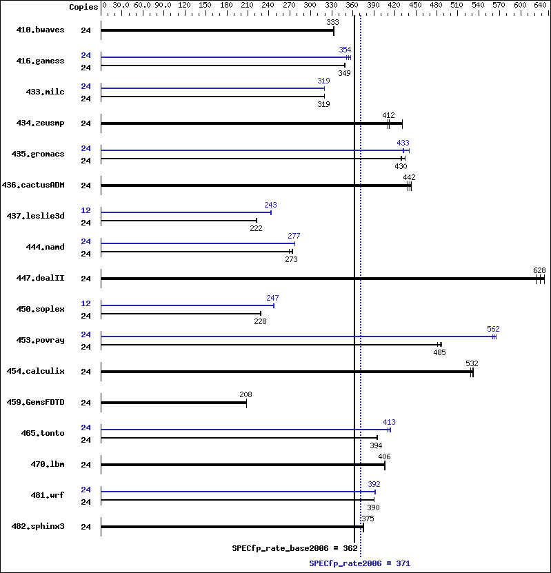 435.gromacs:  -xAVX(pass 2)   -prof-gen(pass 1)   -ipo(pass 2)   -O3(pass 2)   -no-prec-div(pass 2)   -opt-mem-layout-trans=3(pass 2)   -prof-use(pass 2)   -opt-prefetch   -auto-ilp32